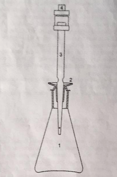 Określoną w monografii szczegółową masę substancji nieorganicznej po dodaniu kwasu solnego lub roztwór otrzymany po mineralizacji substancji organicznej przenieść do kolby (1)