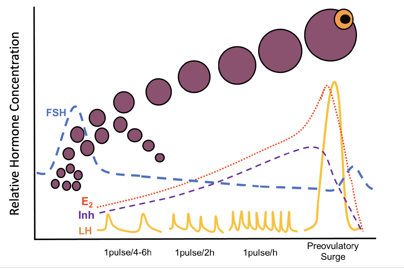 FSH from hypothalamus causes follicles to develop. Follicles produce estrogen which increases, and this estrogen has a positive feedback mechanism on the hypothalamus to send more LH. This makes sense, because