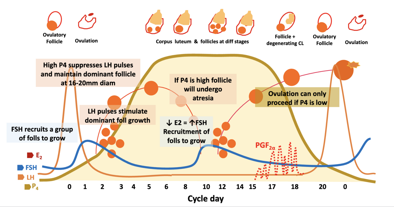 high P4 suppresses LH pulses and maintains a dominant follicle at around 16-20mm