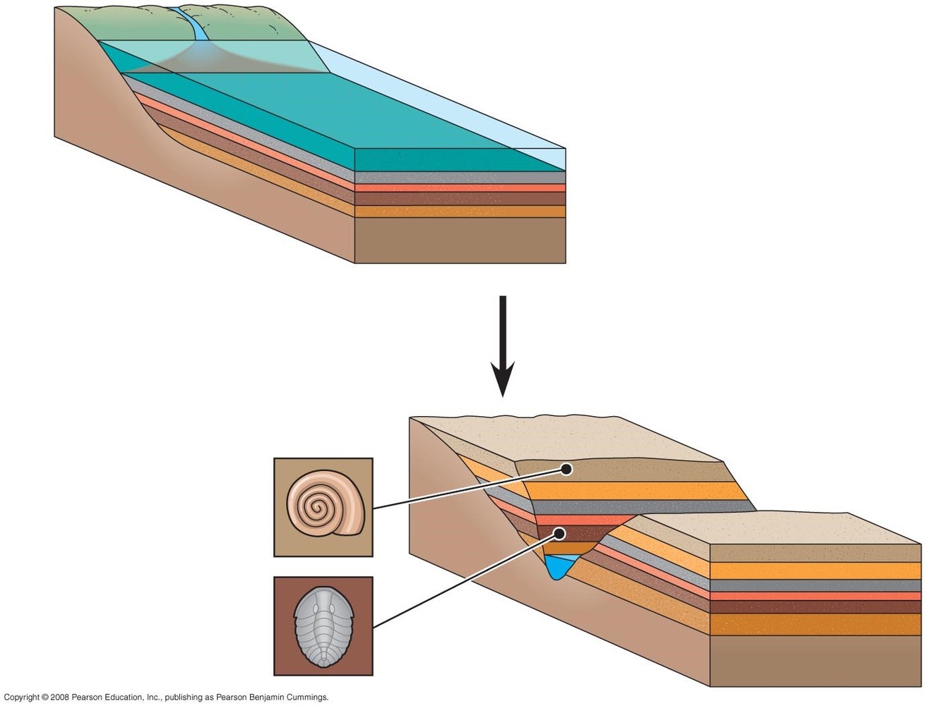 traces of organisms from the past, usually found in seimentary rock. This sedimentary rock appears in layers called STRATA.