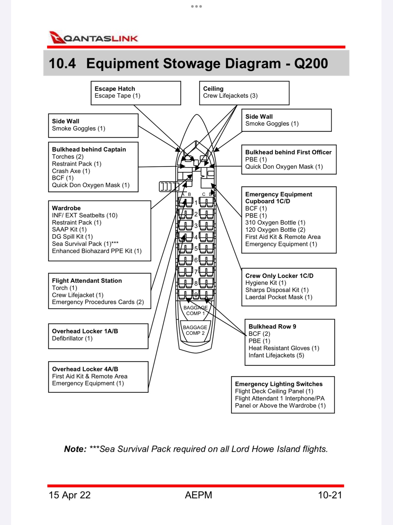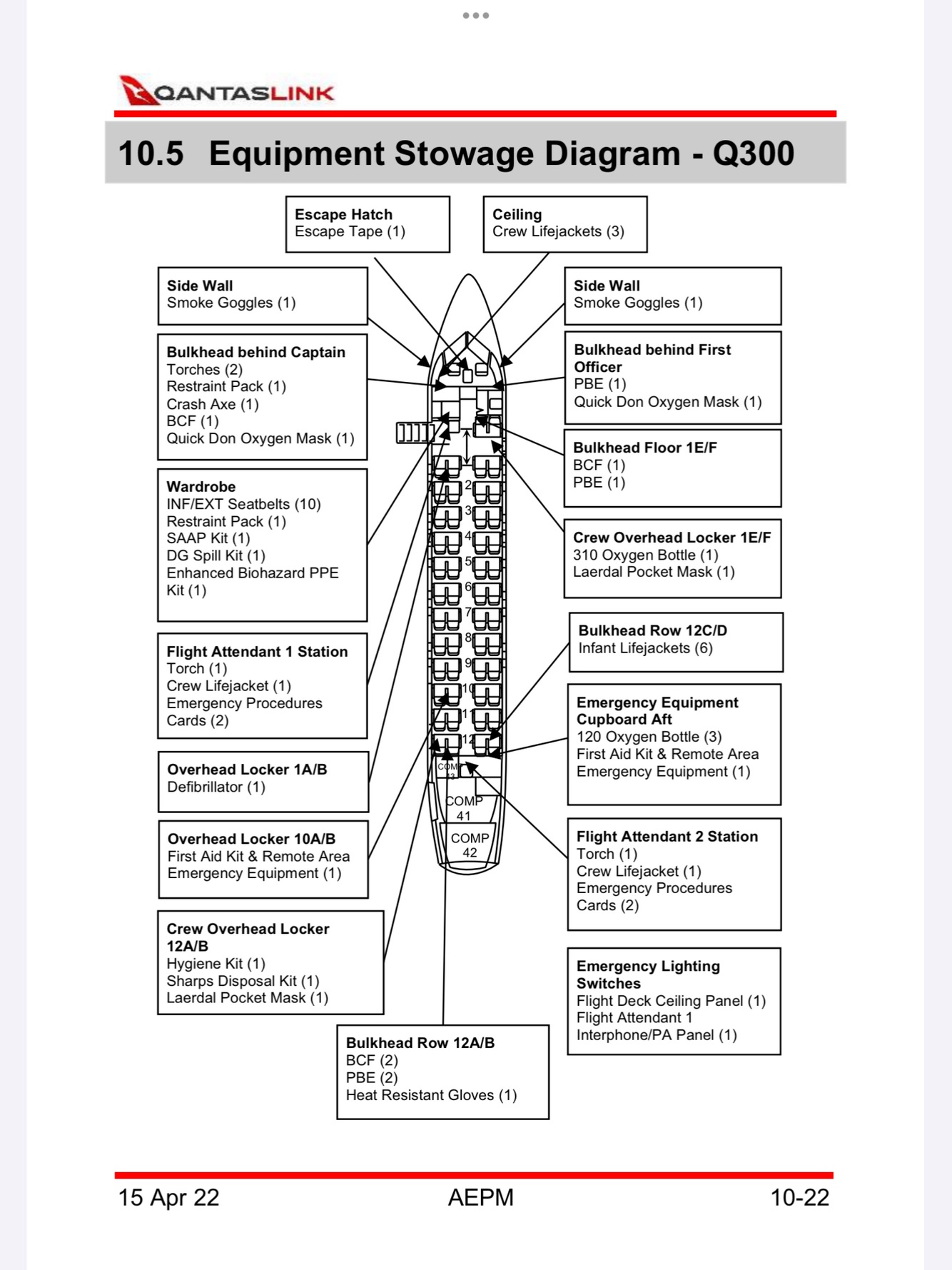 Escape hatch Ceiling Sidewalls Bulkhead behind captain Bulkhead behind FO Wardrobe 1 AB 10AB FA1 station FA 2 station 1EF 1EF floor Bulkhead 12AB Bulkhead 12 CD Emergency equipment cupboard Emergency lighting switch locations