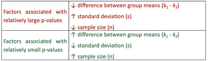 What are the factors associated with large and small p-values?