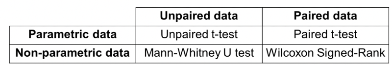 An unpaired t-test is appropriate for analysing parametric data fromindependent samples (unpaired data)