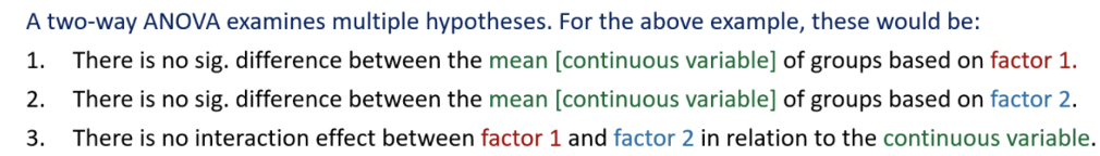 Two-way ANOVA – used when studies also investigate whether there is an interaction between two categorical variables on a single continuous variable. It examines multiple hypotheses.
