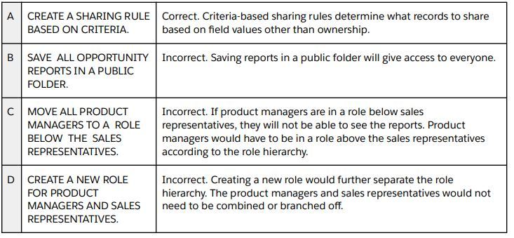 Ursa Major Solar uses a private data access model. Product managers and sales representatives are in different branches of the role hierarchy. What should an administrator do to ensure that product managers can report on opportunities in their product line?