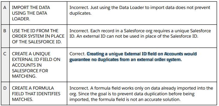 Ursa Major Solar regularly imports accounts from an external order system that has its own ID field for each record. What should the system administrator do to help prevent duplicates during these imports?