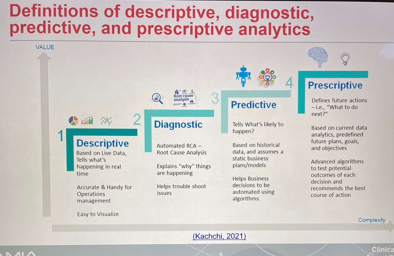 Predictive Analytics = What is likely to happen next? Predictive Analytics are likely the most used/developed in health care. Example: analyzing EHR data to identify patients at risk for a complication from a disease