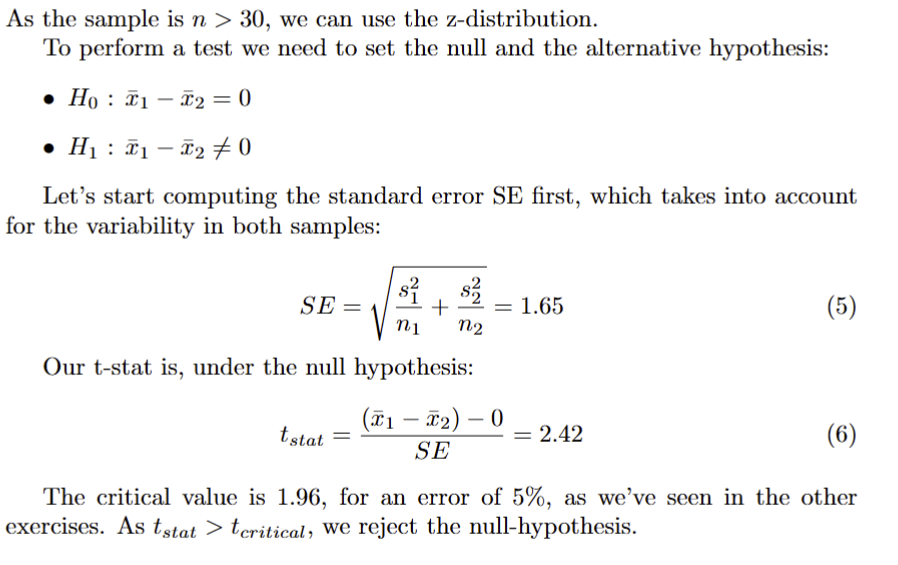 hypothesis testing - comparing to samples - t-test (technically can also be a t-test) - to test whether two means are different or the same - i.e. H0: mu1 - mu2 = 0; H0: mu1 - mu2 is not 0 - set-up of formula for SE: