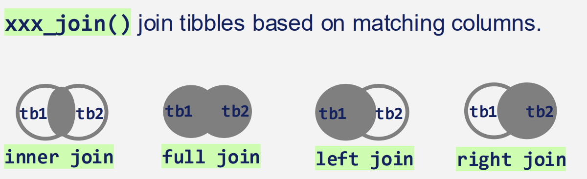 full_join(A,B) - It joins tibble A and tibble B by a common column called colName automatically and results in all rows from both tibbles where matching rows are combined. In the case where there are no matching values the result is NA for the missing ones.