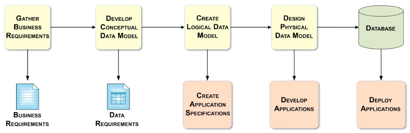 These are the steps in data modelling, going from business requirements to applications and database