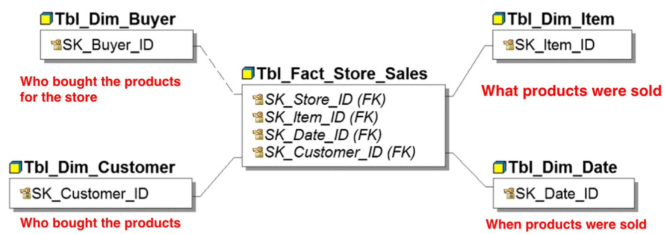 Notice the dashed link to Tbl_Dim_Buyer, who bought the product for the store, rather than a link to a Store ID