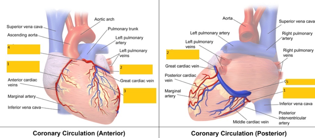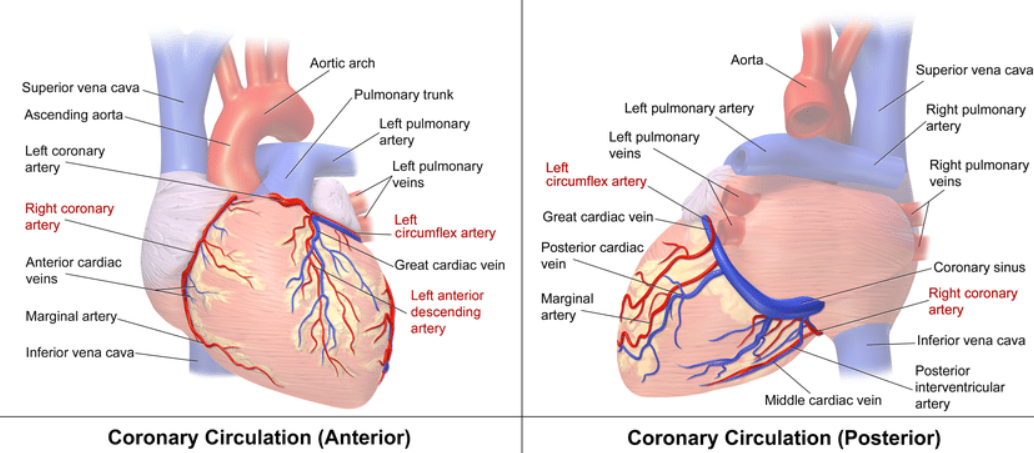 Right atrium and ventricle, inferior LV wall, AV/SA nodes, 1/3 of septum