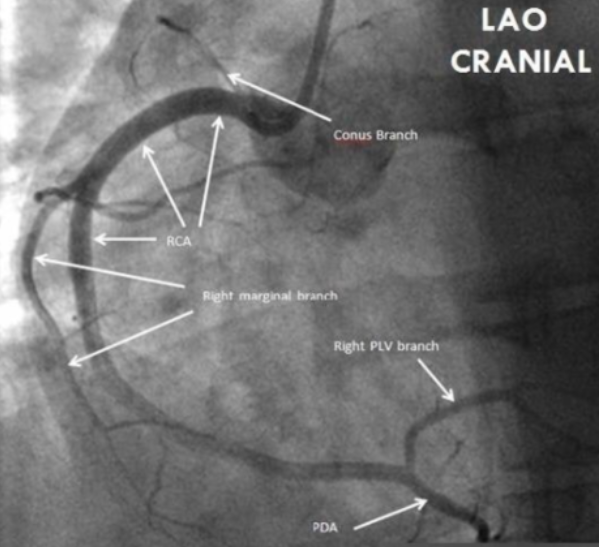 Left anterior oblique (LAO) cranial: Camera is positioned to the patient’s left and angled slightly upwards towards the head