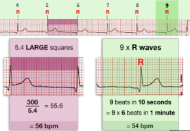 How do you calculate the heartrate in ECG interpretation, in 2 ways?