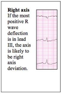 What does right axis deflection look like on an ECG, and which 3 conditions does it indicate?