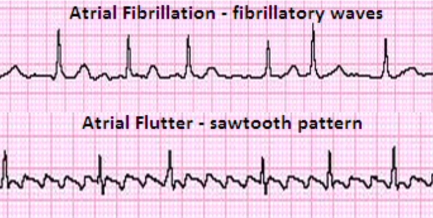Atrial flutter: Sawtooth pattern due to flutter waves