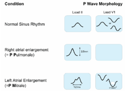 P Mitrale: Broad, bifid (m) P waves due to left atrial hypertrophy, usually secondary to mitral stenosis or regurgitation or systemic hypertension
