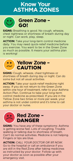 What are the 3 zones on an asthma action plan?