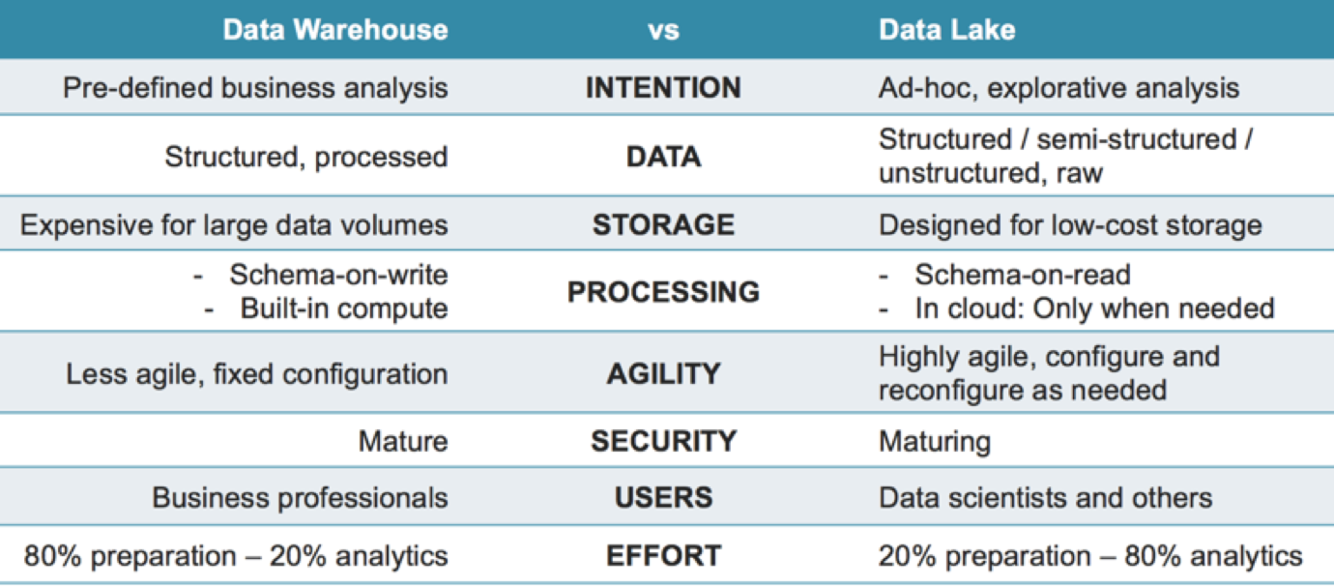 4) Data Warehouse schema known in advance, through design, instead of finding it out as you load the data. Similarly, Data Warehouse usually run on fixed servers in a data centre (although Cloud is becoming popular) versus Data Lakes may be largely in the Cloud, with computing power called upon as needed.