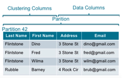 • Primary Key: made up of a partition key and clustering columns