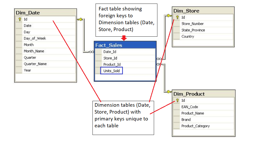 In the image below, the unique primary key for each Dimension table is included in the Fact table.