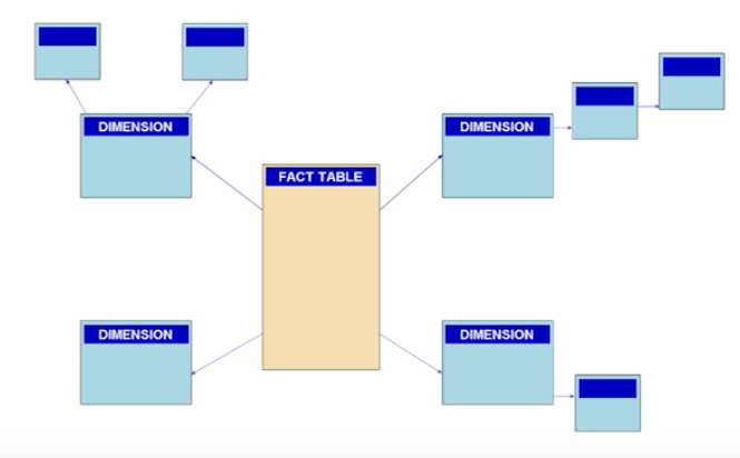 Logical arrangement of tables in a multidimensional database represented by centralized fact tables which are connected to multiple dimensions.