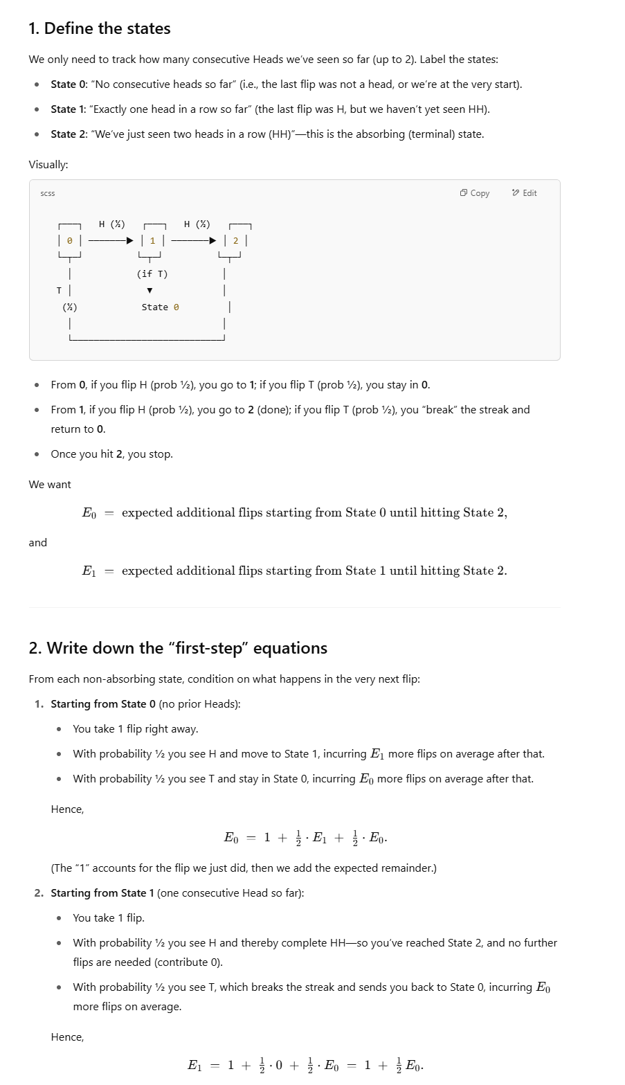 To find the expected number of fair‐coin flips until you see two heads in a row (HH), you can set up a simple Markov‐chain…