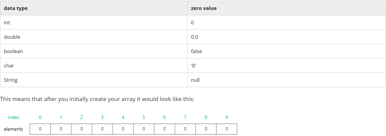 When you first create an array it is filled with “zero values”. Each primitive has an associated zero value, where as the zero value for objects is null. Null literally means “no object”.