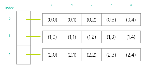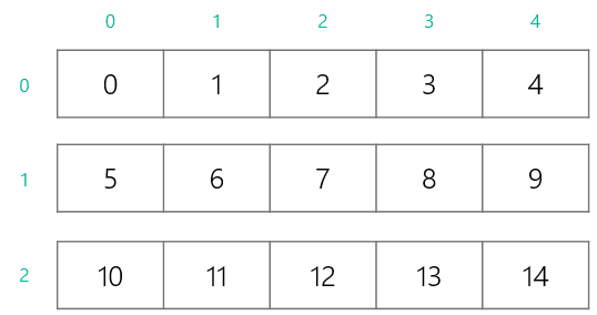 In this case you have an outer array with a capacity of 3, which stores 3 separate arrays of ints, each of which can store up to 5 ints.
