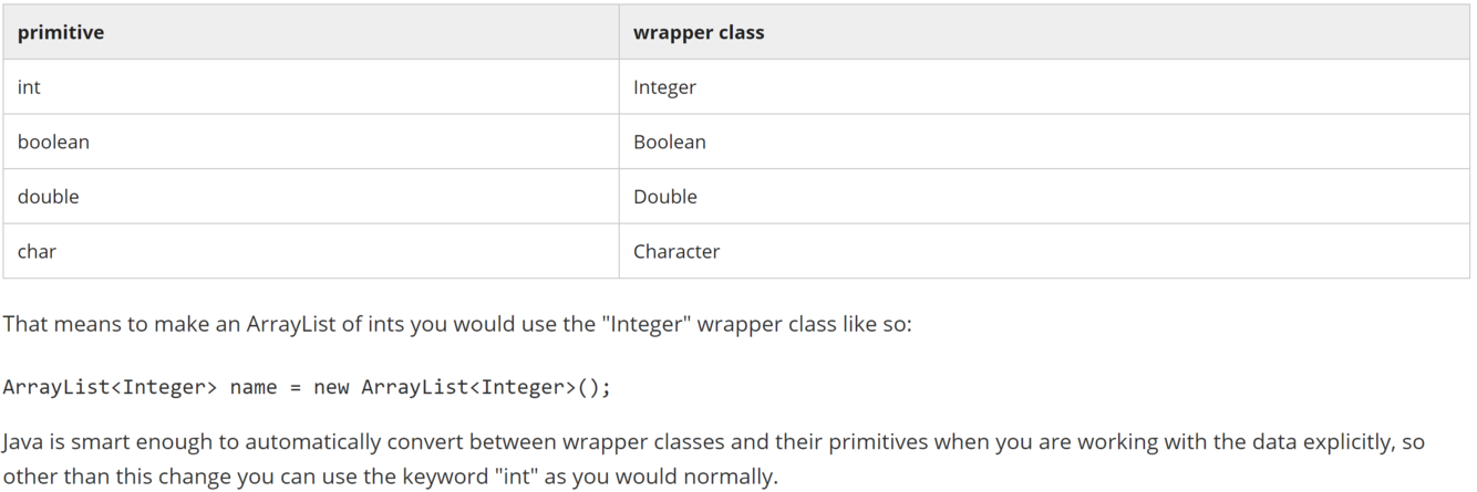 However, ArrayLists require that you give them an object as a data type. This means that primitive data must first be converted into objects