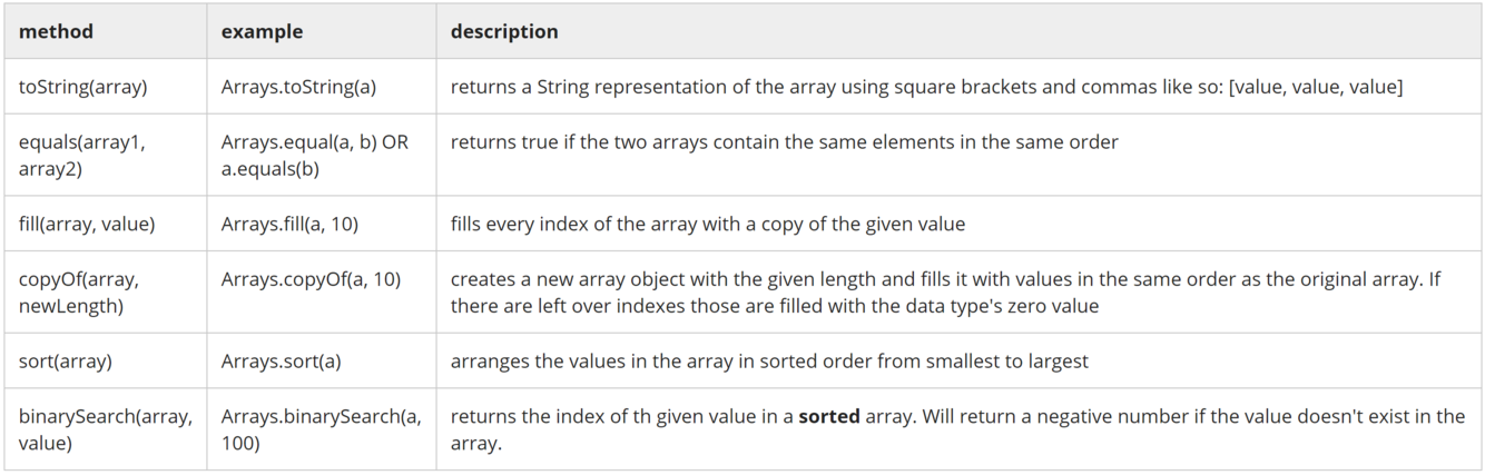 Java also provides an Arrays class that has a series of methods you can use on your own array instances. If you have ever used the Java Math class you will find the syntax very familiar. You start the statement with “Arrays” followed by the method you want to use and pass in the array instance you want to operate on as a parameter.