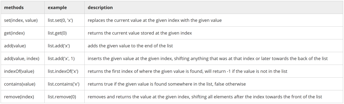 These methods function exactly as you would expect based on how we used arrays. ArrayLists have 0 based indexes, just like arrays, and when you set a value it will override whatever value was stored there before. To know how many elements are currently stored in an ArrayList you use the .size() method like so: