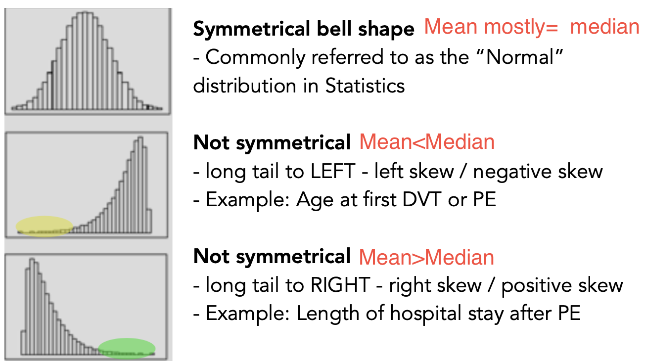 - Measures of central tendency (mean, median) if data is not normally distributed. Measures of spread if the data is normally distributed. (standard deviation, range)