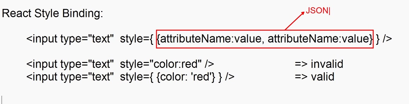 <input type=”text” style={{attributeName:value,attributeName:value}} /> (value must be string, style attributes are javascript objects)