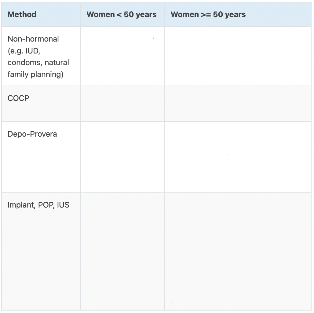 however, there are some concerns about the effect of progesterone-only injections (Depo-provera) on bone mineral density and the UKMEC category of the IUS and IUD is 2 for women under the age of 20 years, meaning they may not be the best choice