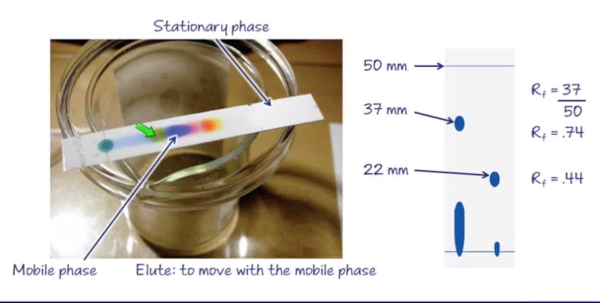 One Close to original dot is better aligned with the mobile phase. The one that has travelled the furthest is more aligned with the stationary phase. Rf is distance traveled/max distance
