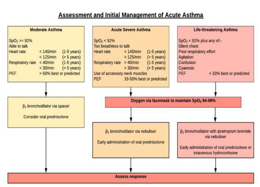 Management stages of acute asthma attack in ER