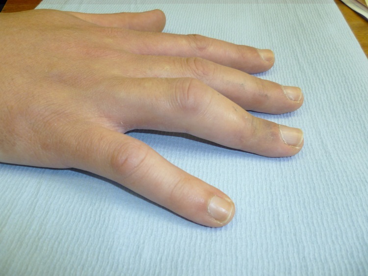 A photograph of his hand is shown below; radiographs were normal.