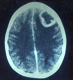 The CT head scan shows a frontal space occupying lesion with rim enhancement suggesting tumour/metastasis or abscess.