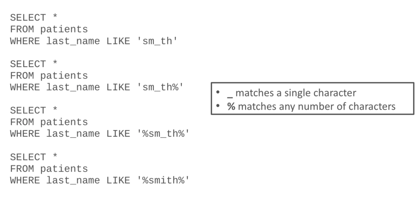 Purpose: To specify a combination of one or more expressions and logical operators that evaluates to either TRUE, FALSE or unknown Comparison operators =, !=, >, =, <=, [NOT] IN, [NOT] BETWEEN x AND y, [NOT] LIKE, EXISTS, IS [NOT] NULL