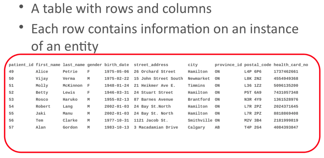 Sometimes referred to as a record, the horizontal rows of a database. Each row contains one or more columns, and each row in a table contains the same columns.