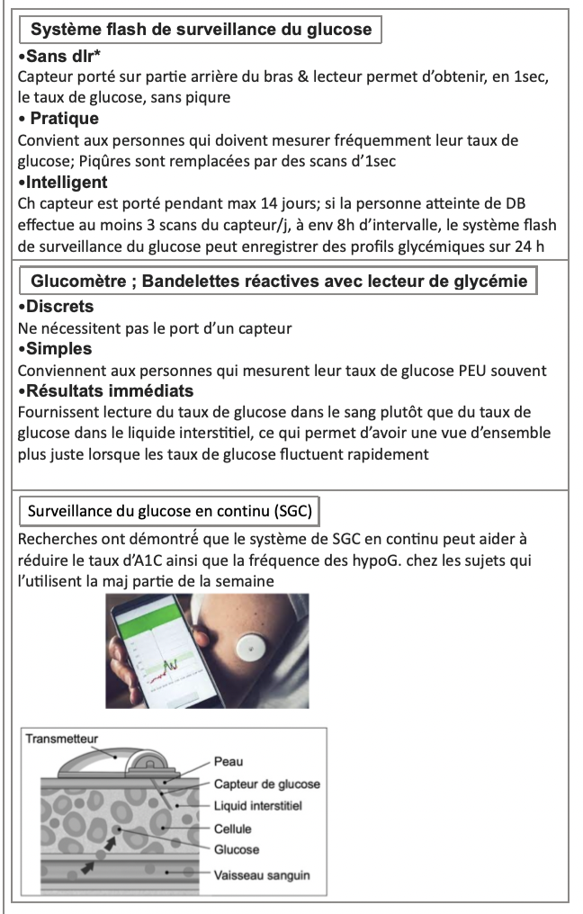 - DB1: au moins 3x/j (incluant mesures pré & postprandiale) ou mesure continue
