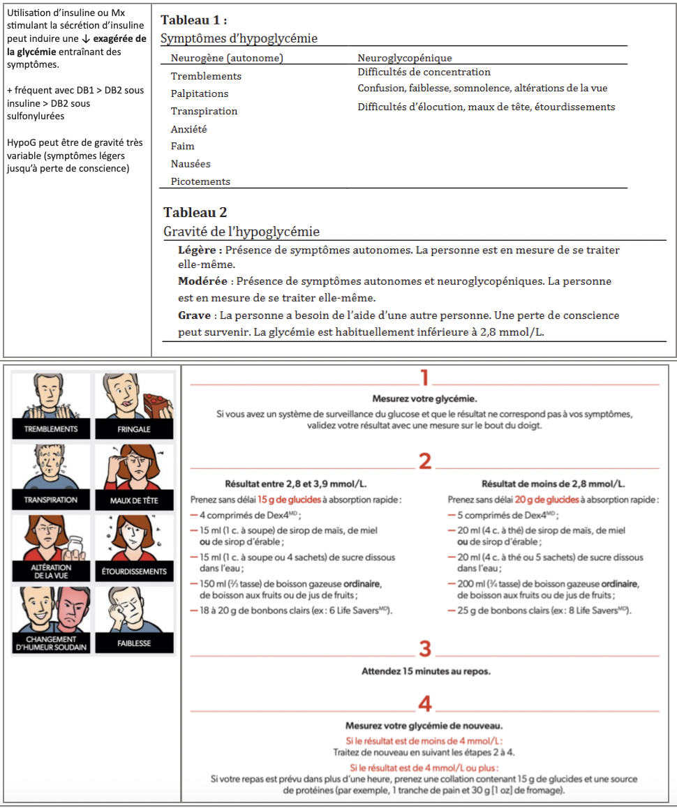 Utilisation d’insuline ou Mx stimulant la sécrétion d’insuline peut induire une ↓ exagérée de la glycémie entraînant des symptômes.