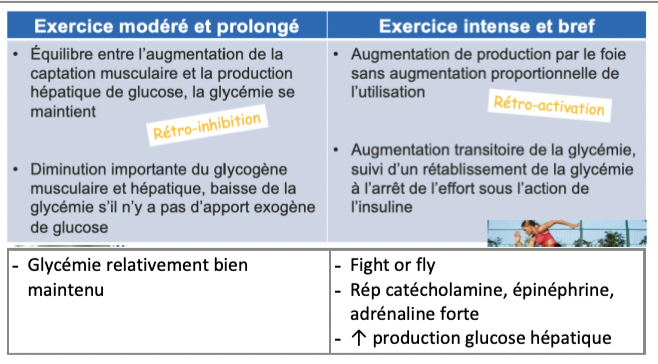 * Si insulinémie demeure élevée (dû à injection ou sécrétagogue exo) = empêche activation production glucose hépatique = risque d’hypOg durant ou post-AP (DB1 ou DB2 sous insuline)
