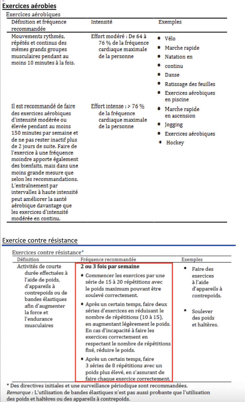 - q ≥ 150 min/sem d’AP d’intensité modérée (40-60%) à intense (60-90%), réparties sur min 3 jours (marche, vélo, jogging), no more then 2 consecutive days btw bouts act