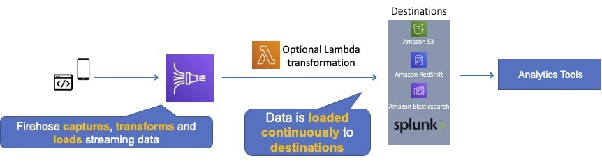 Kinesis Data Firehose captures, transforms, and loads streaming data that you can deliver to destinations like S3 for later analysis