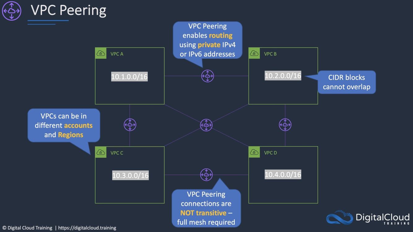 A VPC peering connection is a networking connection between two VPCs that enables you to route traffic between them using private IPv4 or IPv6 addresses.
