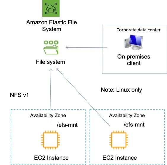Amazon Elastic File System (Amazon EFS) provides a simple, scalable, fully managed elastic NFS file system for use with Cloud services and on-premises resources.
