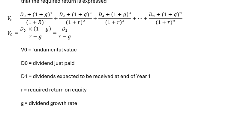 V0 = fundamental value D1 = dividends expected to be received at end of Year 1 D2 = dividends expected to be received at end of Year 2 P2 = price expected upon sale at end of Year 2 r = required return on equity
