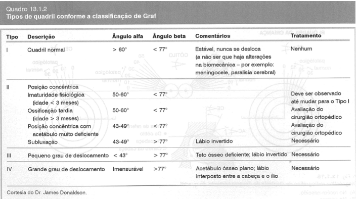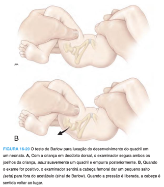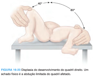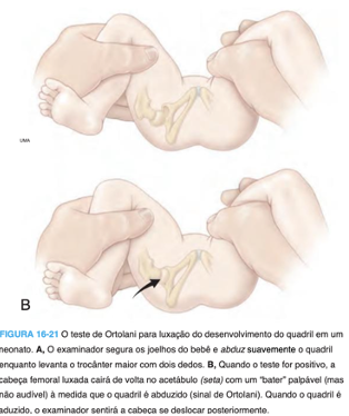 O RN nasce com 15-20° de encurtamento em flexão do quadril e do joelho, o que é um achado normal nessa fase. No paciente com DDQ o quadril e o joelho estenderão completamente quando o primeiro estiver luxado posteriormente, podendo até ser hiperestendido.